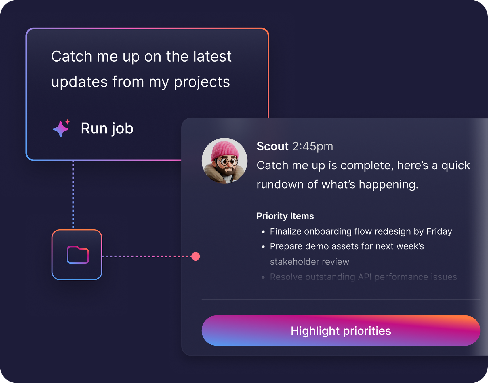 Scout has the intelligence and contextual know-how to take action on even the most cumbersome work, speaking the language of your team, your clients, and your projects.